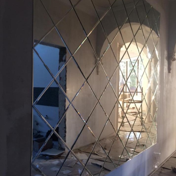 Использовалась серебристая зеркальная плитка формы "вытянутый ромб".